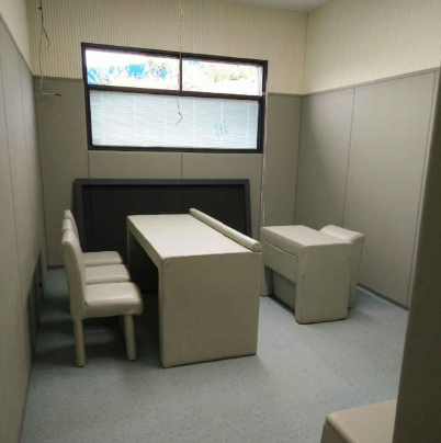 審訊室布局考慮到訊問的嚴肅性和成像效果,訊問室內(nèi)的布置和顏色,以及審訊桌椅的色調(diào)必須烘托主題,營造審訊的氛圍。派出所、檢察院等辦案區(qū)訊問室的墻面有嚴格要求,墻面材料需要兼具環(huán)保、防撞、阻燃特性,與傳統(tǒng)的聲學(xué)材料相比,新型材料更加具備以上的能力,能大大提高審訊安全性。從訊問室的威嚴性和攝像機拍取視頻圖像的角度說,訊問室整體裝修色調(diào)不要太花哨,不易進行過多的擺設(shè)。