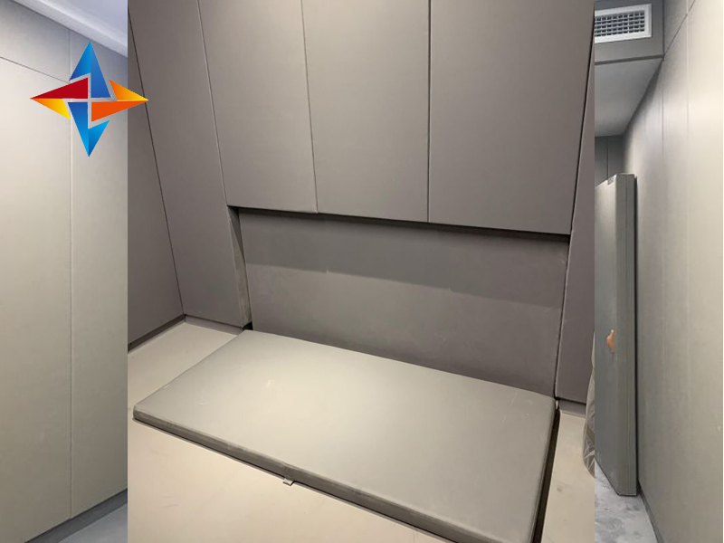 防撞床有一層木底板,方便軟包型條在上面固定。按照圖紙工藝鋪訂型條?!⑿蜅l按墻面劃線鋪釘,遇到交叉時在相交位置將型條固定面剪出缺口以免相交處重疊。遇到曲線時,將型條固定面剪成鋸齒狀后彎曲鋪釘。安裝型條的尺寸填方海綿。將面料剪成軟包單元的規(guī)格,根據(jù)海綿的厚度略放大邊幅,用插刀將面料插入型條縫隙。插入時不要插到底,待面料四邊定型后可邊插邊調(diào)整。如果面料為同一款素色面料,則不需要將面料剪開,先將中間部分夾縫填好,再向周圍延展。將面料插人型材內(nèi)。緊靠木線條或者相鄰墻面時可直接插入相鄰的縫隙,插入面料前在縫隙邊略涂膠水。如果沒有相鄰物將面料收入型條與墻面的夾縫,若面料較薄,則剪出一長條面料粘貼加厚,再將收邊面料覆蓋在上面插入型條與墻面的夾縫,這樣側(cè)面看上去就會平整美觀簡潔。