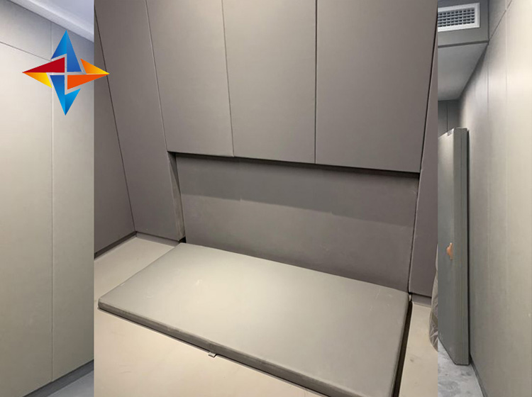 防撞床有一層木底板,方便軟包型條在上面固定。按照圖紙工藝鋪訂型條。 將型條按墻面劃線鋪釘,遇到交叉時在相交位置將型條固定面剪出缺口以免相交處重疊。遇到曲線時,將型條固定面剪成鋸齒狀后彎曲鋪釘。安裝型條的尺寸填方海綿。將面料剪成軟包單元的規(guī)格,根據(jù)海綿的厚度略放大邊幅,用插刀將面料插入型條縫隙。插入時不要插到底,待面料四邊定型后可邊插邊調(diào)整。如果面料為同一款素色面料,則不需要將面料剪開,先將中間部分夾縫填好,再向周圍延展。將面料插人型材內(nèi)。緊靠木線條或者相鄰墻面時可直接插入相鄰的縫隙,插入面料前在縫隙邊略涂膠水。如果沒有相鄰物將面料收入型條與墻面的夾縫,若面料較薄,則剪出一長條面料粘貼加厚,再將收邊面料覆蓋在上面插入型條與墻面的夾縫,這樣側(cè)面看上去就會平整美觀。