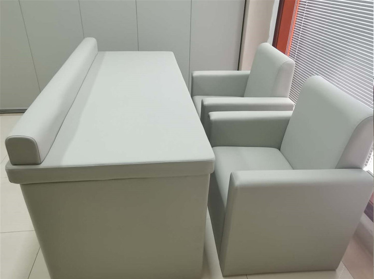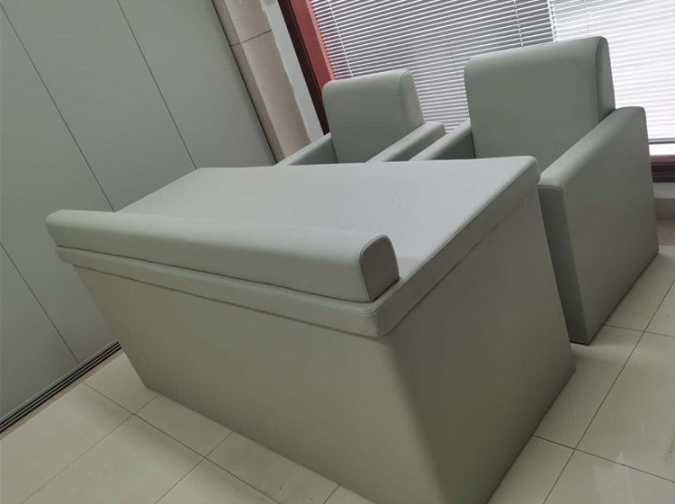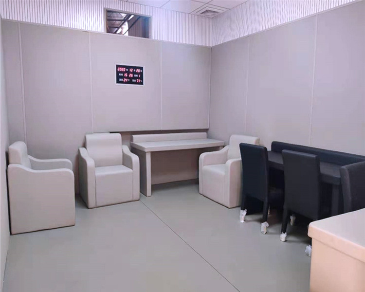 紀(jì)委審訊室防撞軟包墻面常用規(guī)格為1250*2450mm,防撞材料基材為無膠復(fù)合工藝的聚乙烯發(fā)泡棉,等級為B1級阻燃,E0級環(huán)保。墻面高于2.4米的部分采用阻燃吸音板,達(dá)到室內(nèi)錄音清晰的效果。